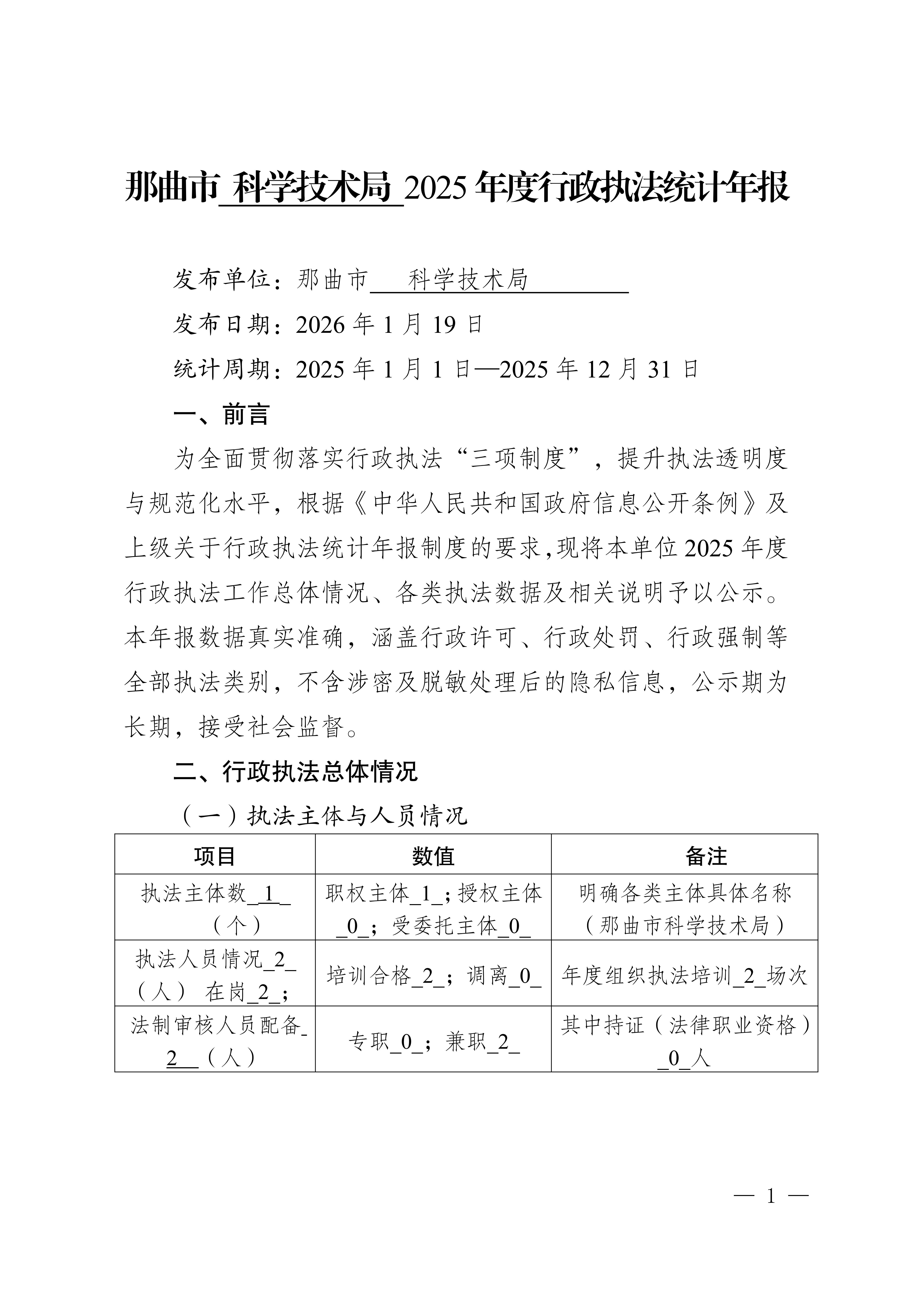 那曲市科学技术局2025年度行政执法统计年报